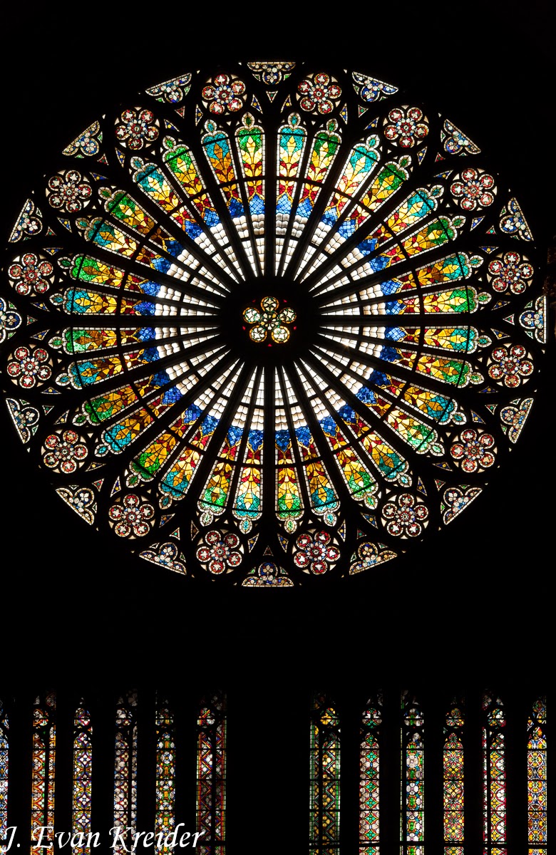 This rose window uses medieval tracery (the seemingly delicate stone structure which holds the various panes of glass) but the glazing itself is modern. I had to wonder is this is what other stained glass windows looked like to medieval adults requiring, yet lacking, spectacles--brilliant blurred colours.